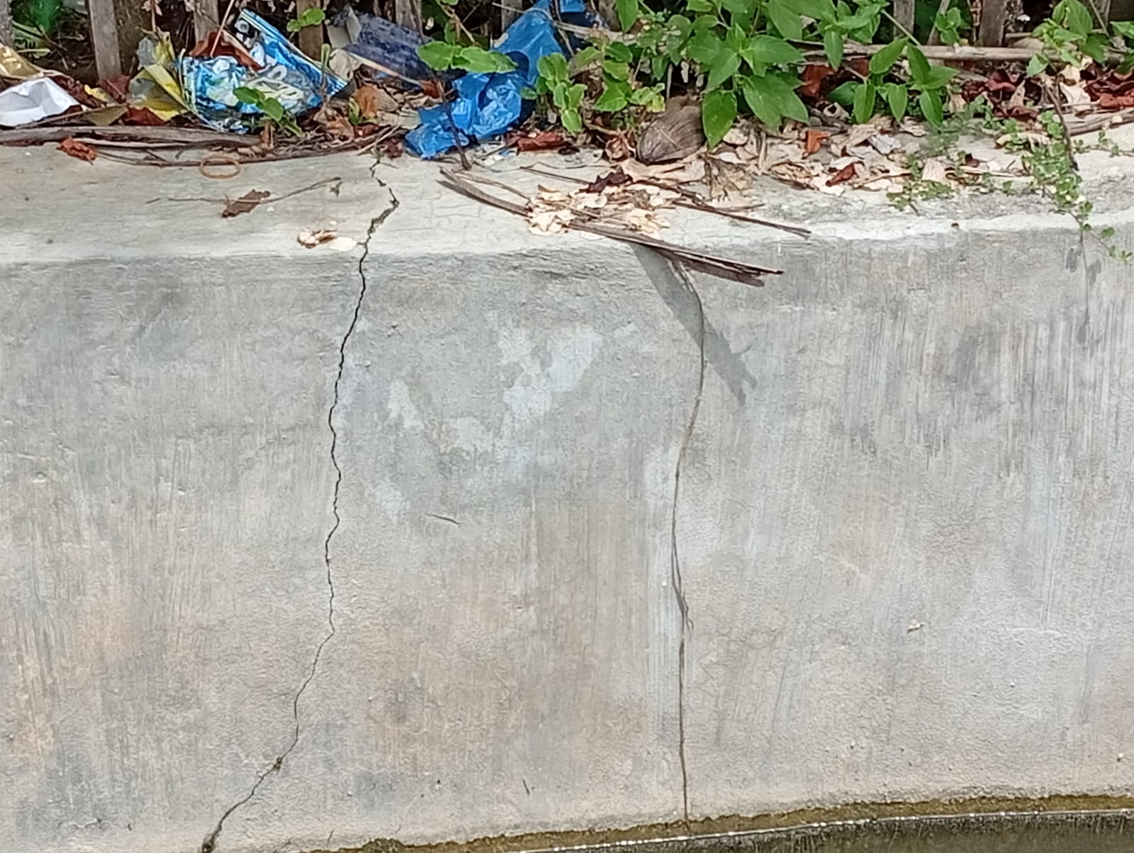Berdasarkan pantauan awak media di lapangan, tampak beberapa bagian saluran drainase mengalami keretakan yang cukup signifikan. Retakan tersebut terlihat jelas di permukaan struktur beton, bahkan di beberapa tempat telah mulai mengelupas, menimbulkan kekhawatiran akan ketahanan konstruksi dalam jangka panjang.