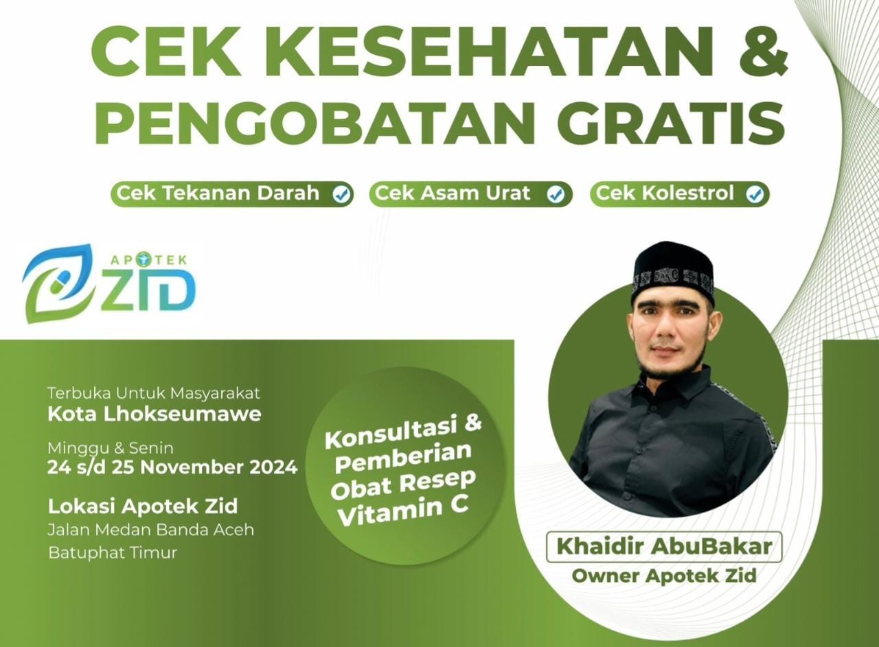 Lhokseumawe, DOBRAK POST – Apotek Zid akan memulai layanan Cek Kesehatan dan Pengobatan Gratis bagi masyarakat Kota Lhokseumawe mulai besok, Minggu, 24 November 2024.